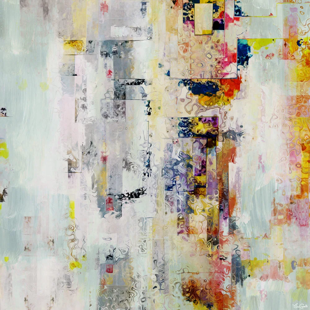 A fun and joyful abstract art with an array of colors that flow from one to the next. The colors are gracefully light and combined with wide sweeping brush stroke texture. The movement and flow is balanced with angular square lines and shapes that makes for a very inviting contemporary piece.