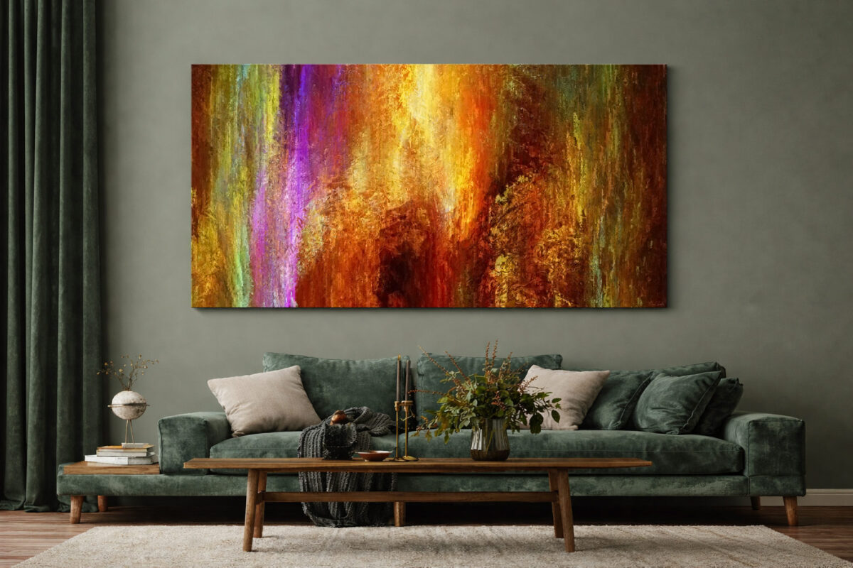Large contemporary abstract painting with a beautiful use of color to create energy and movement with positive and uplifting feel. The arrangement of forms with light and dark creates a fabulous composition that moves as though it were alive. The browns and golden hues give a grounded feel while the bright tones create illumination that expresses a feeling of hope, growth, and life.