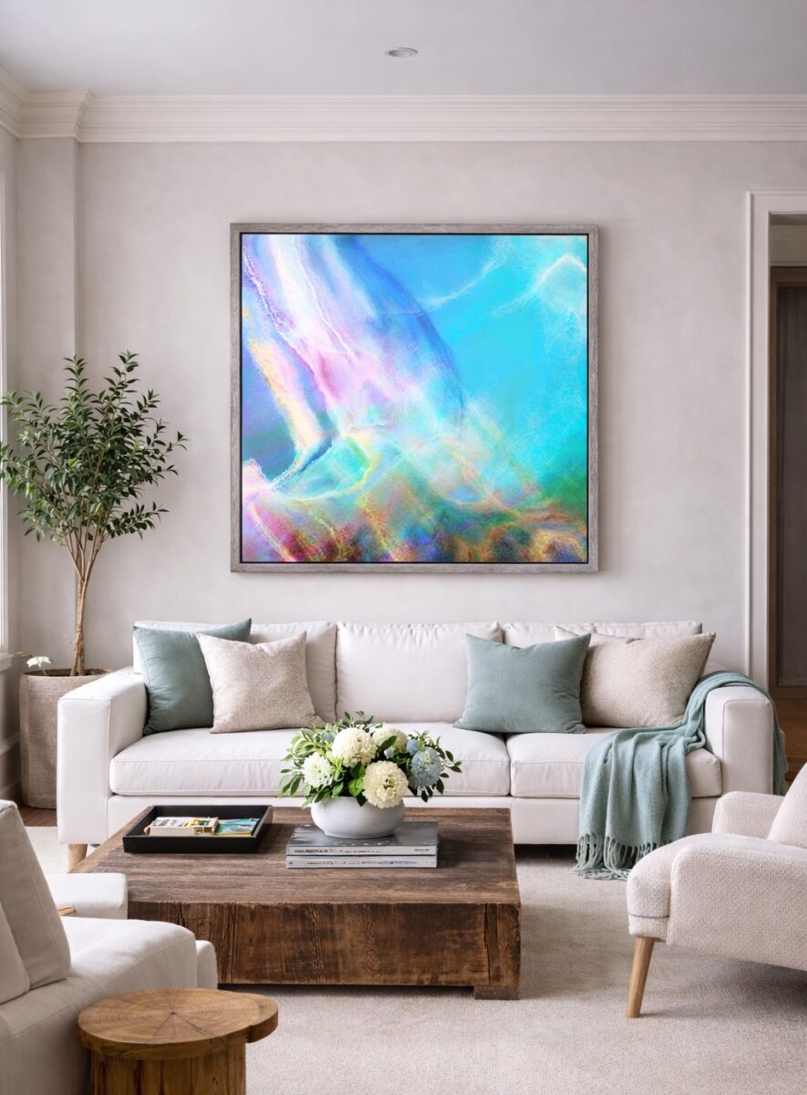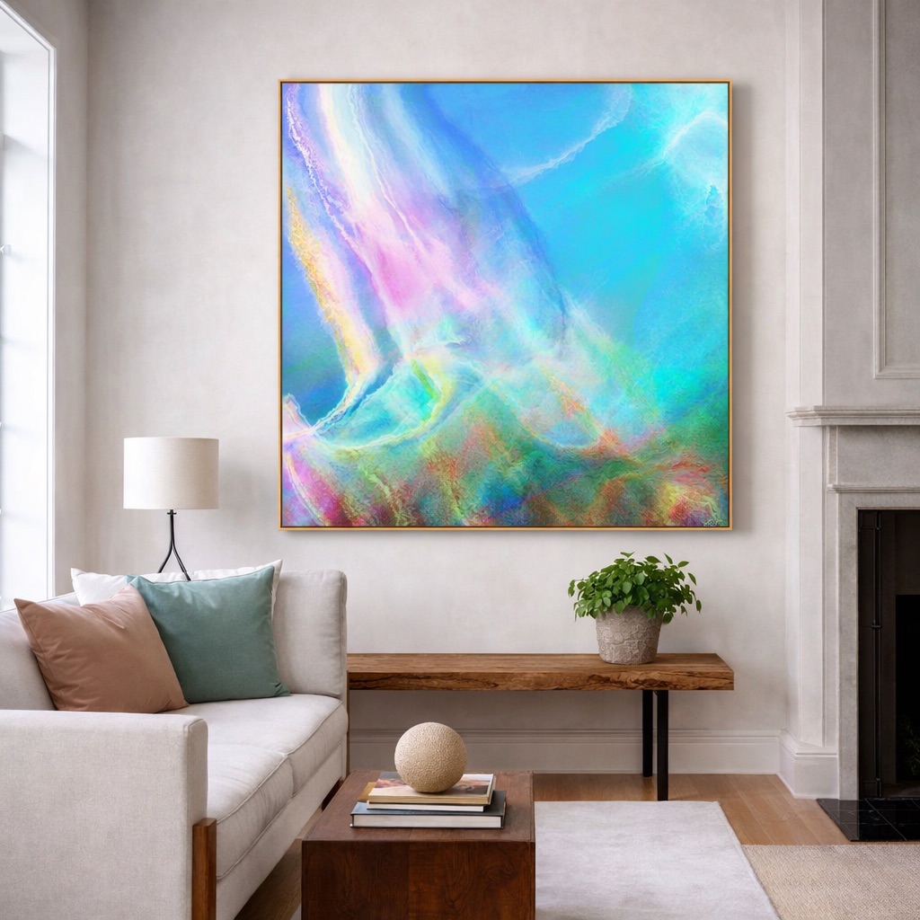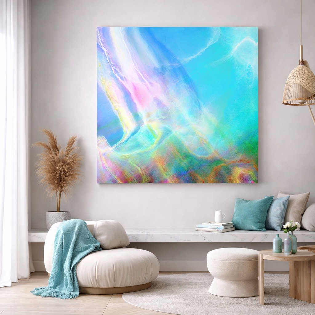 Warm Seas is a striking large contemporary abstract art inspired by the fluid movement of ocean water and the glowing warmth of sunlight reflecting across the sea. This abstract seascape painting blends soft flowing shapes with layered blue, aqua, and green color transitions that create a sense of movement, depth, and calm energy. Designed as modern square canvas wall art, this abstract art makes a beautiful focal point in contemporary interiors. Its calming palette and sweeping forms bring a sense of openness and tranquility to living rooms, bedrooms, offices, and modern architectural spaces.